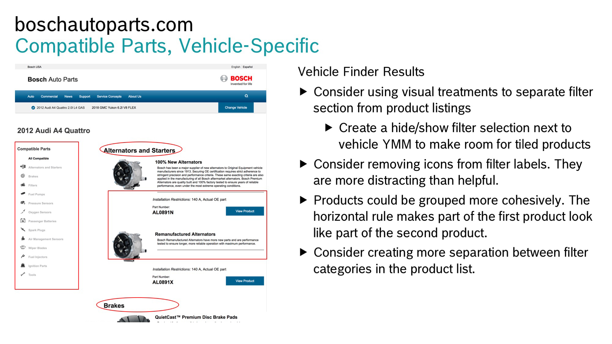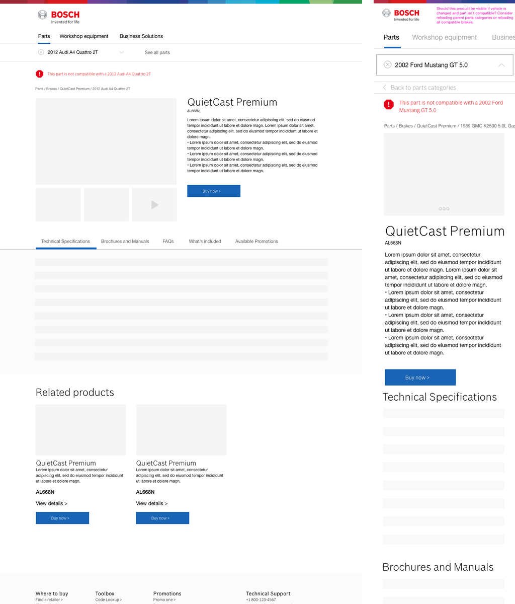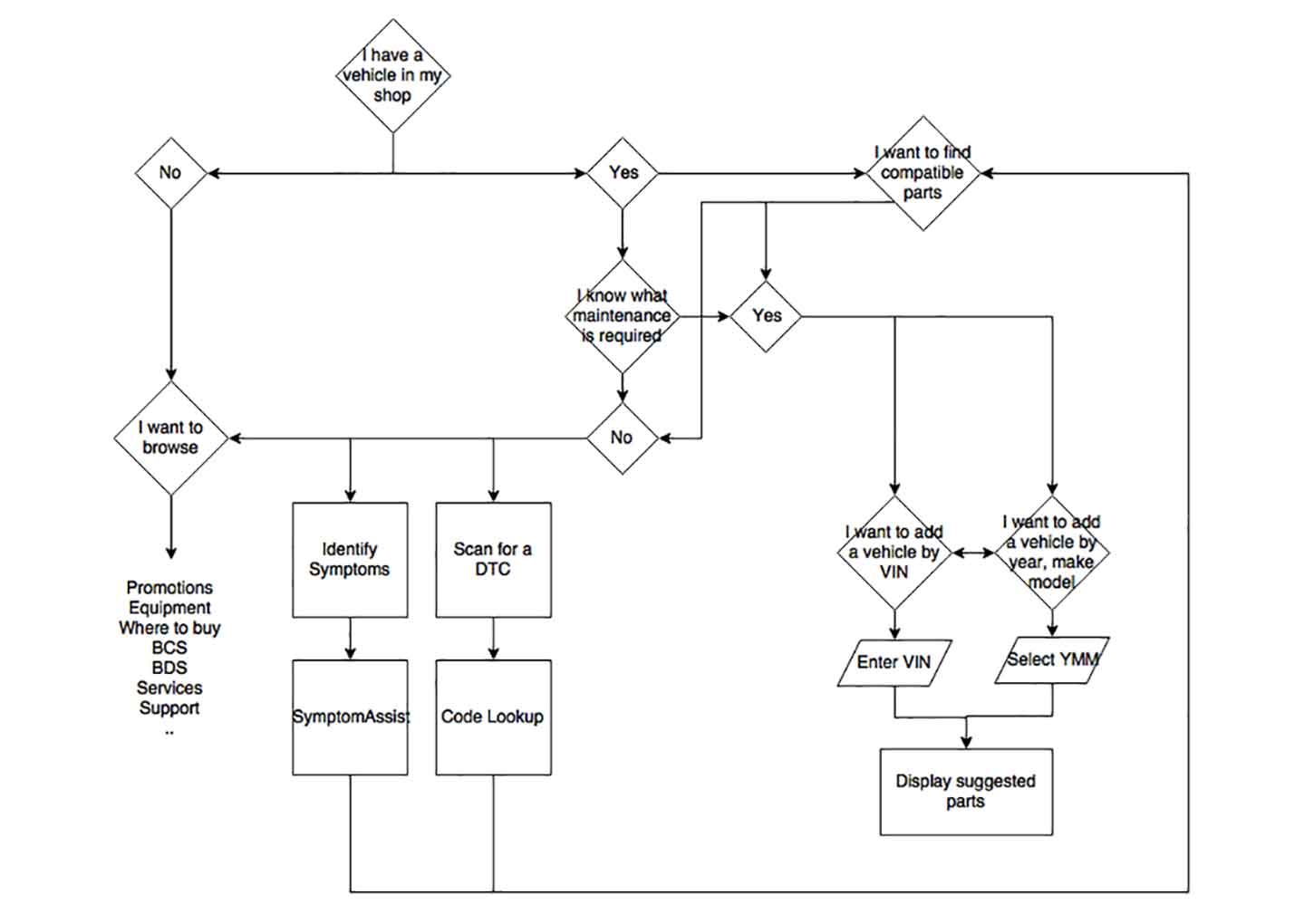 With the information architecture in place and an understanding of what the audience needs were, I created basic user flows that allowed the shop owner or technician to accomplish the primary goals of the website – add a vehicle by Year/Make/Model or VIN, find compatible parts, find local distributors, retailers or online shops for purchase.