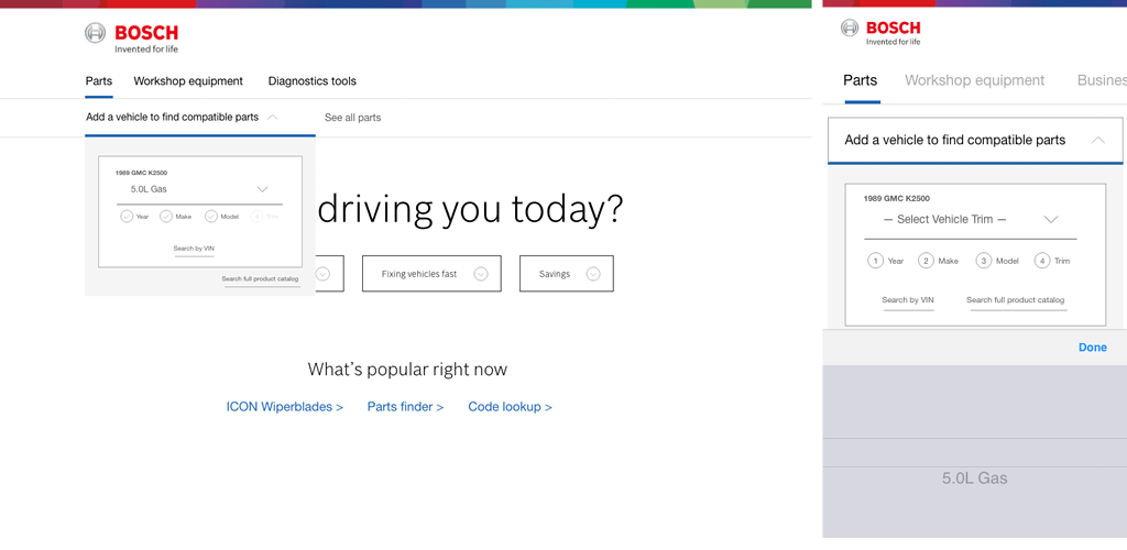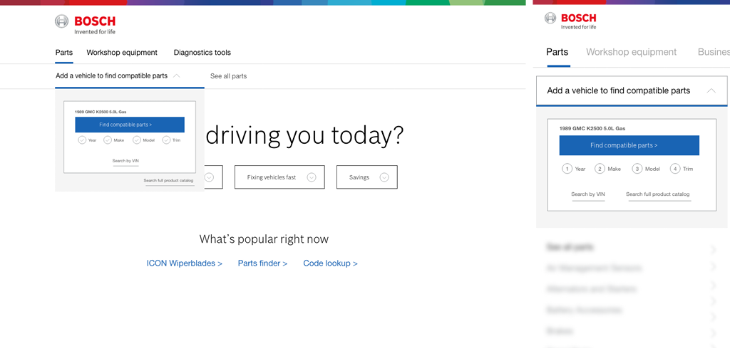 This example shows how a user would add a vehicle by year, make, model or VIN, then find compatible parts related to the specific vehicle. VIN is set as default because 71% (US), 75% (UK), 79% (DE) of users said they prefer to look up vehicles this way.