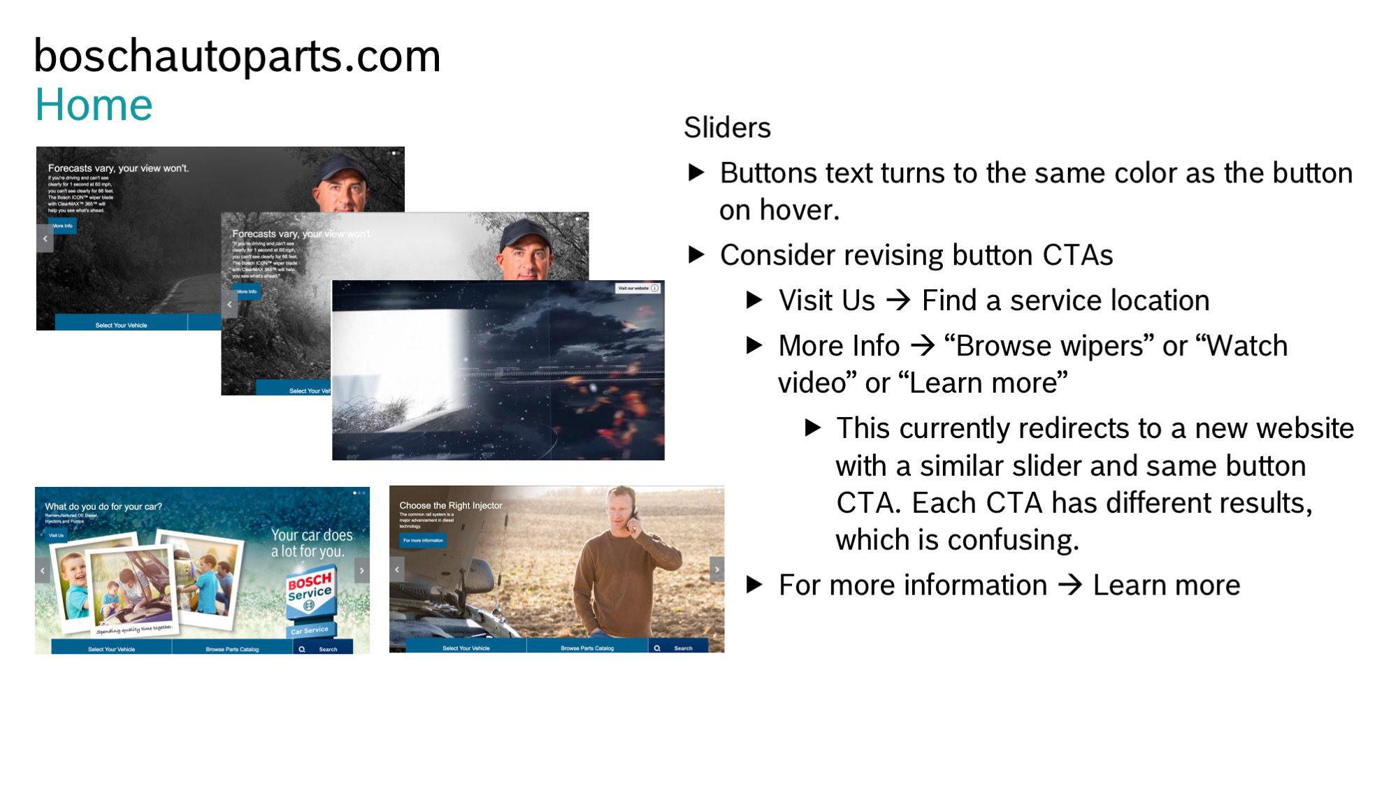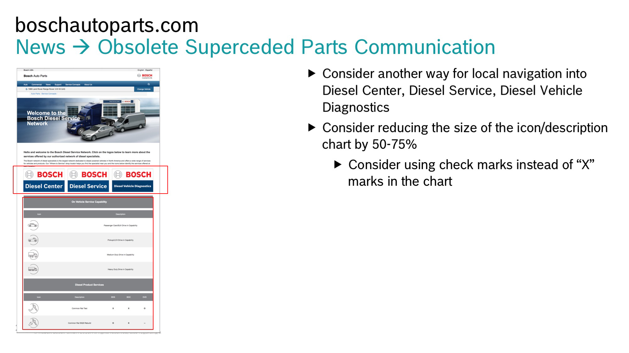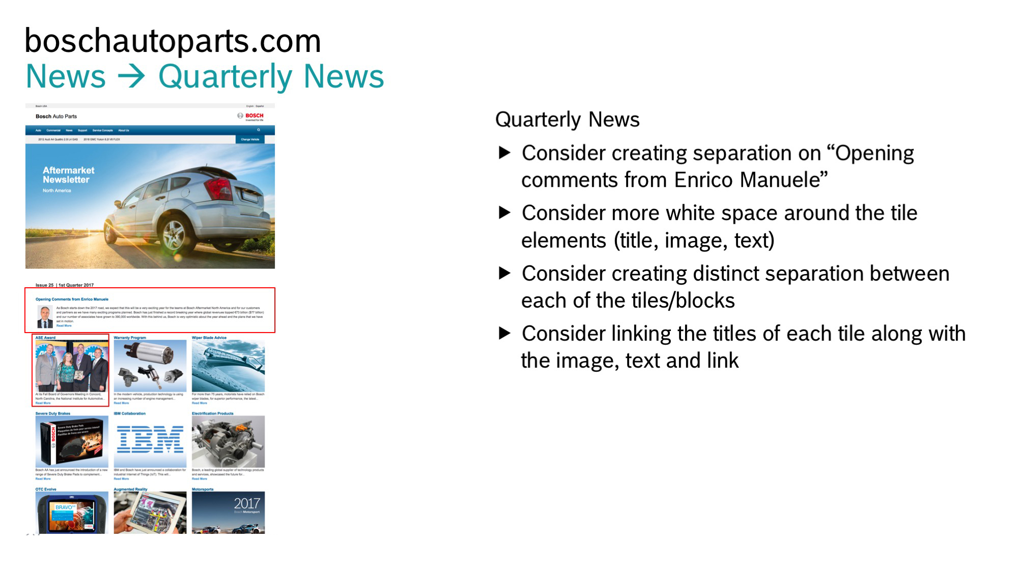 Consolidate ~60 regional Bosch Automotive websites into one global product. Implement the new digital corporate communications messaging strategy. Increase content quality and relevance, optimize information architecture and increase conversions.