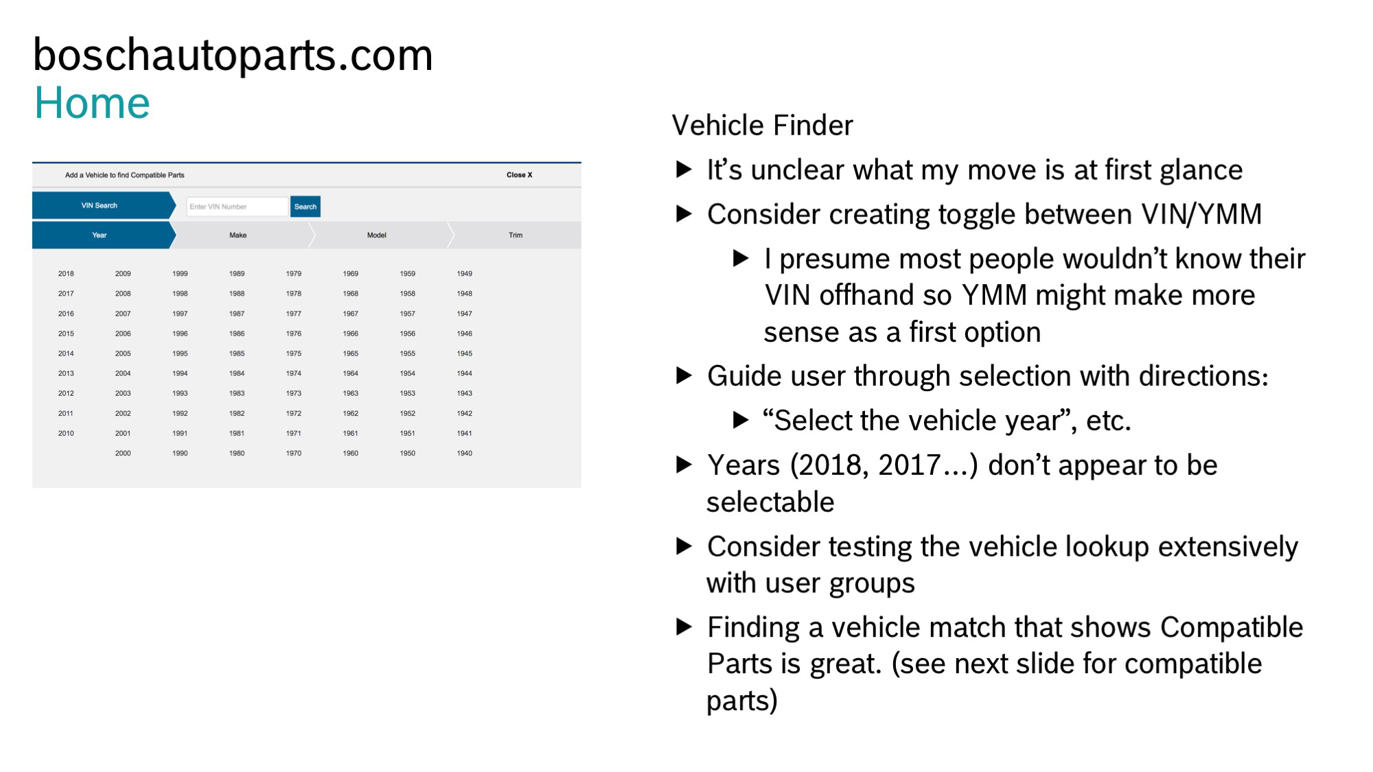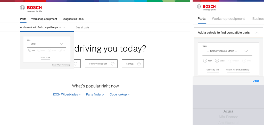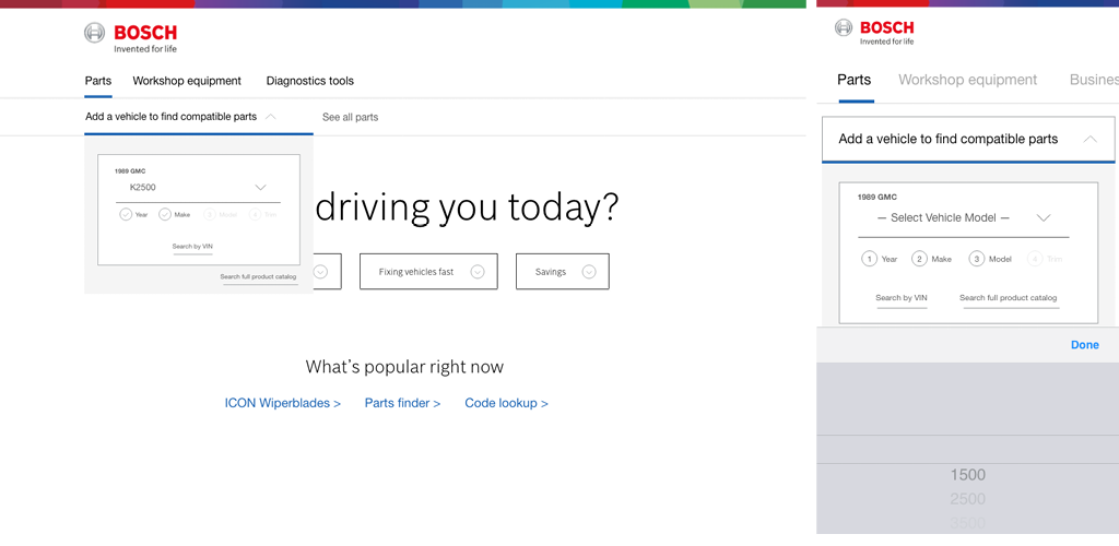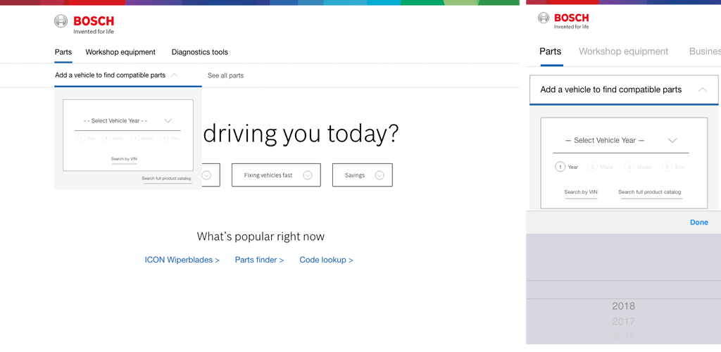 This example shows how a user would add a vehicle by year, make, model or VIN, then find compatible parts related to the specific vehicle. VIN is set as default because 71% (US), 75% (UK), 79% (DE) of users said they prefer to look up vehicles this way.