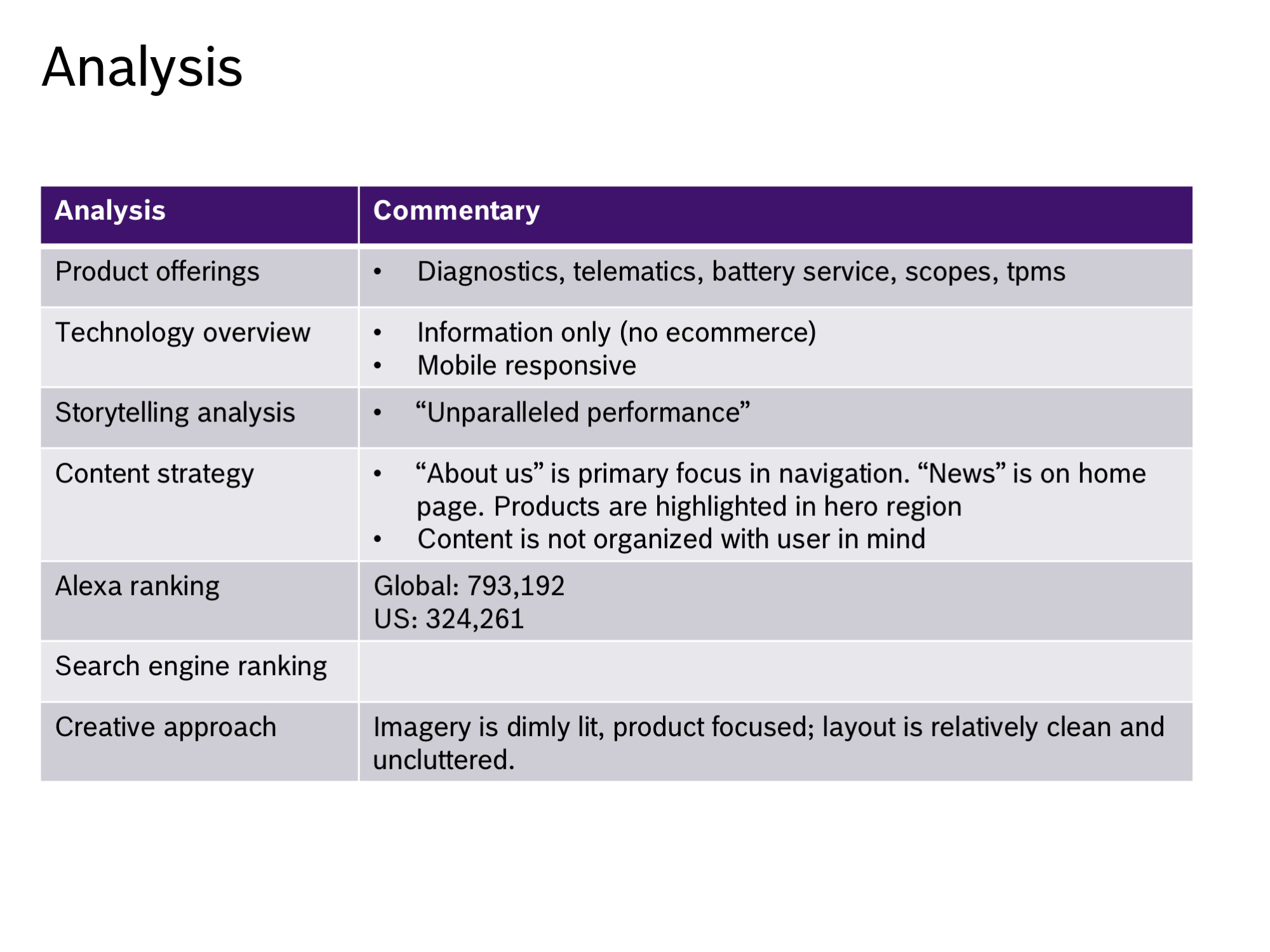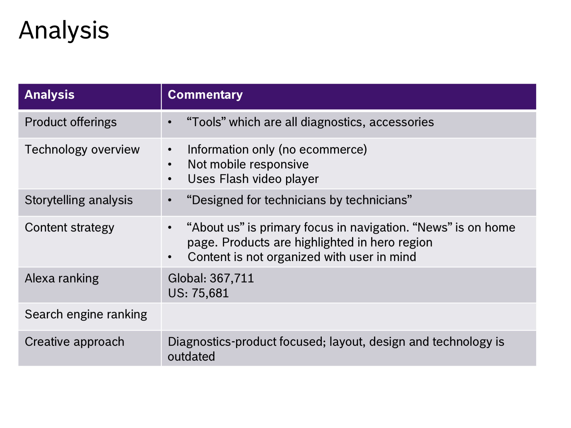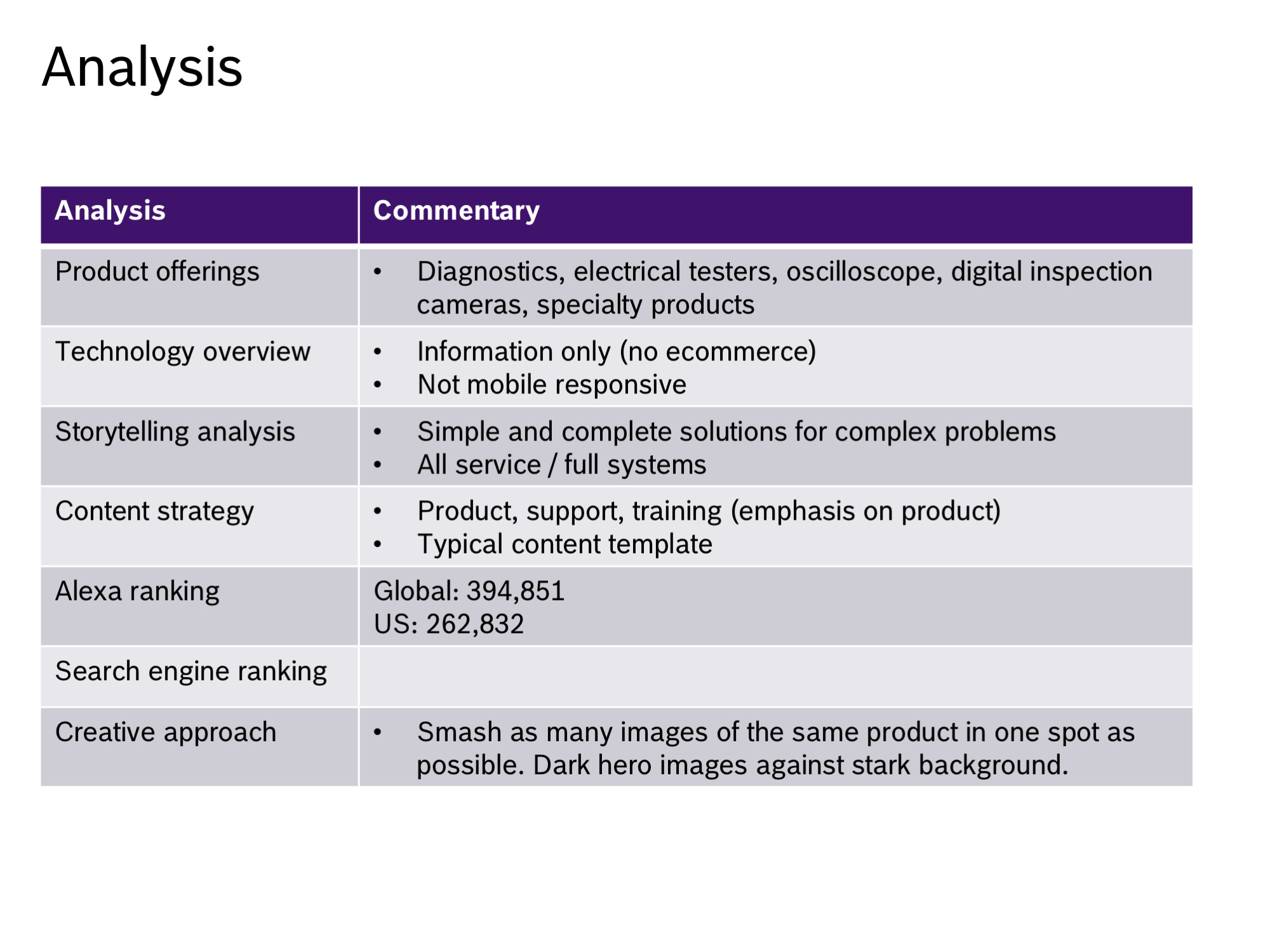The project began by identifying key competitors, analyzing their product offerings, technology, storytelling, content strategy, Alexa ranking and general creative approach. In most cases, a SWOT analysis was also done.