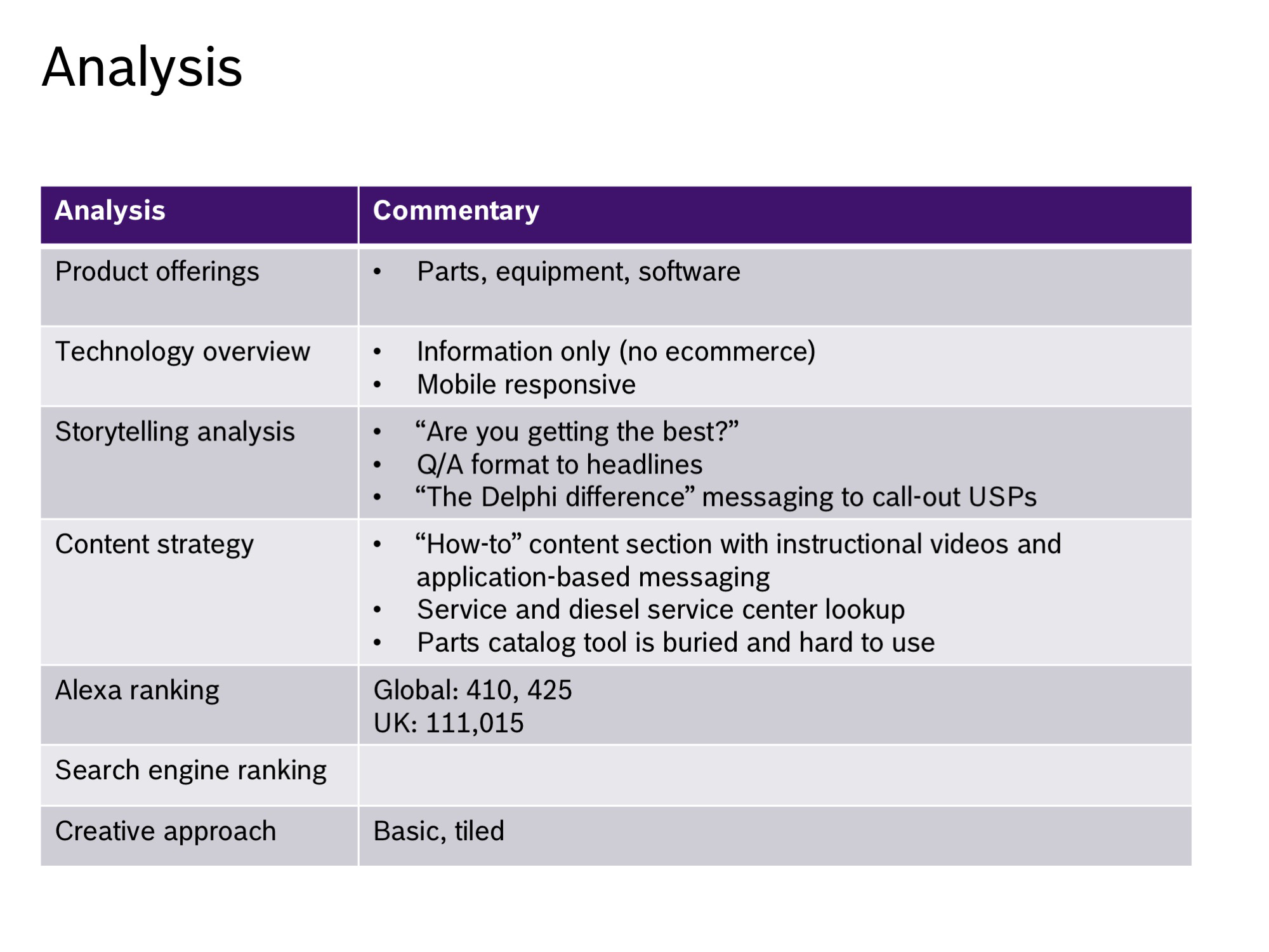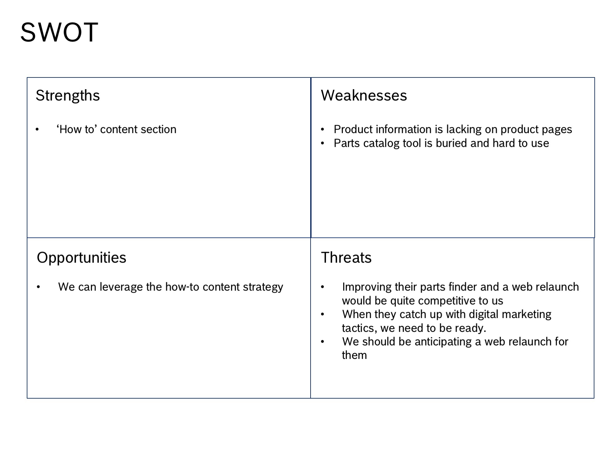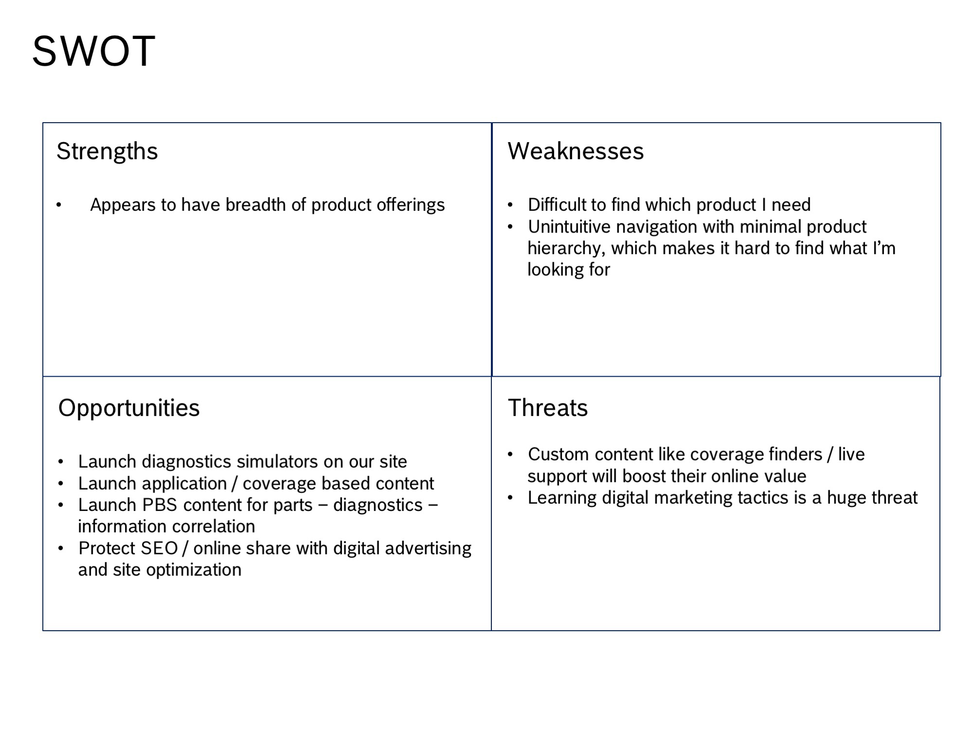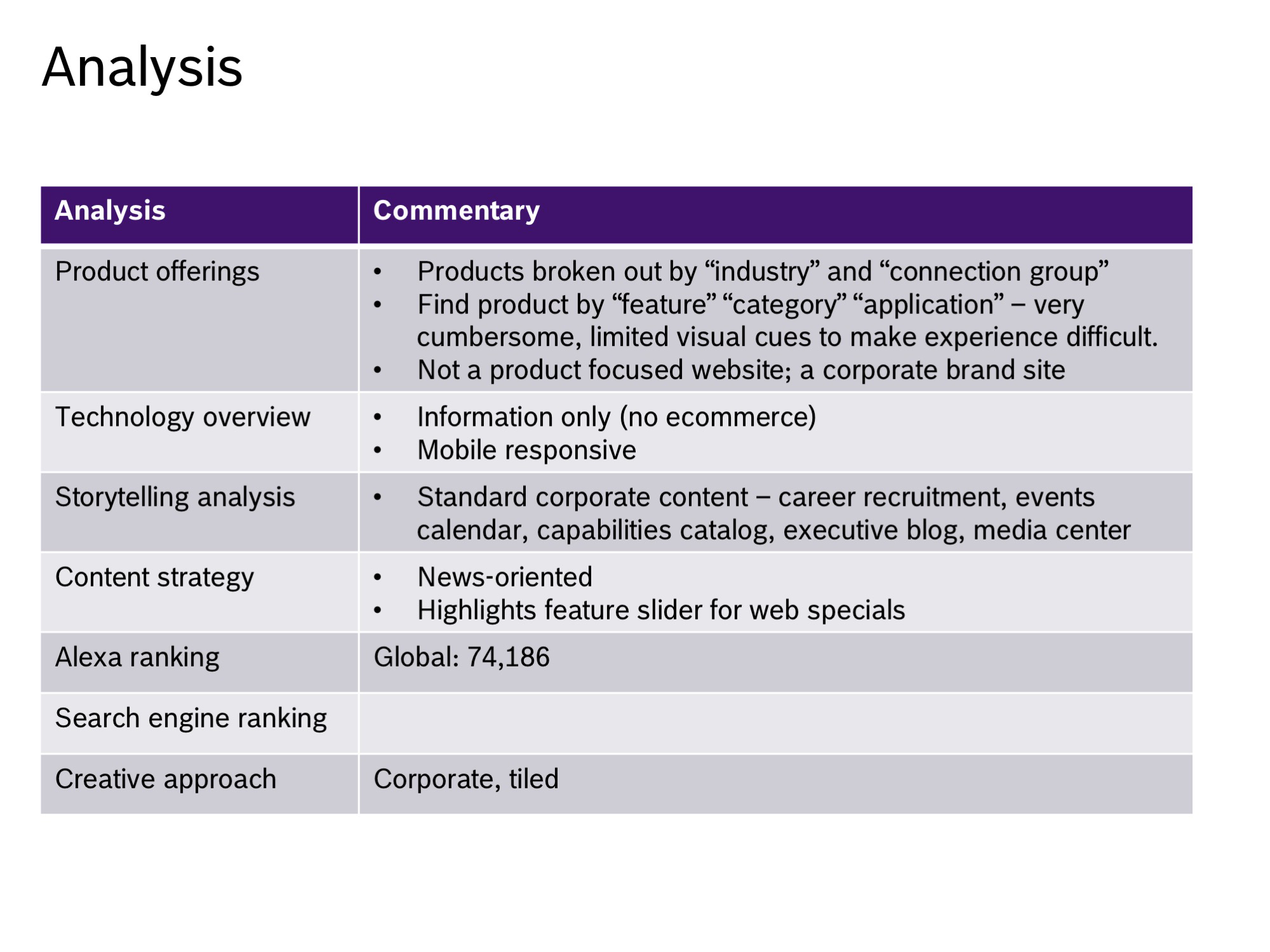The project began by identifying key competitors, analyzing their product offerings, technology, storytelling, content strategy, Alexa ranking and general creative approach. In most cases, a SWOT analysis was also done.